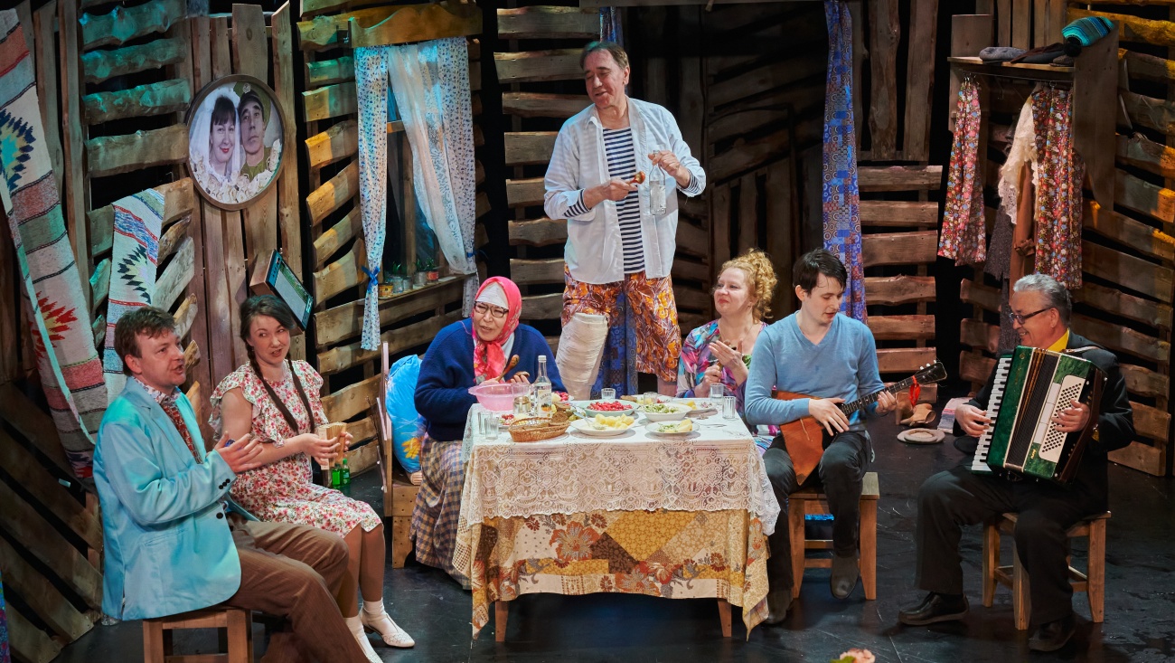 На сцене разрез деревенского дома с узнаваемым интерьером. Здесь и те самые узорчатые половички, занавески, типичная сельская вешалка, иконы в углу, зелёный лучок на подоконнике. Добавьте к этому прохудившуюся крышу, с которой без конца капает вода, и сени, где в потёмках жильцы постоянно натыкаются на заставленные вещи.