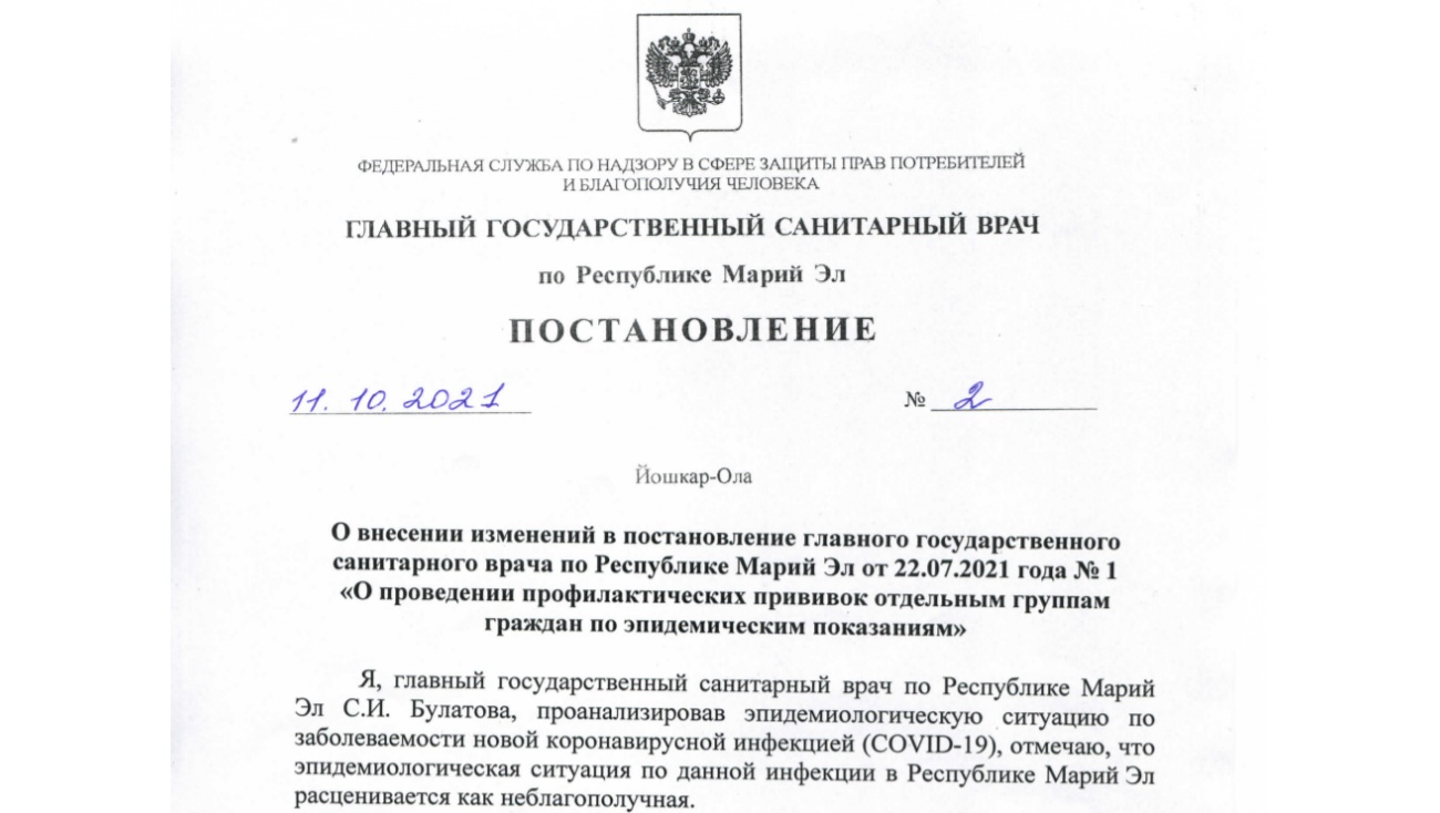 В постановление № 1 от 22.07.2021 года главного государственного санитарного врача РМЭ Светланы Булатовой внесены изменения.