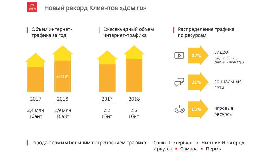 Объем интернет-трафика в сети телеком-оператора «Дом.ru» за год вырос на 21% по сравнению с 2017 годом и достиг более 2,9 млн Тбайт, что сопоставимо с просмотром 725 млн фильмов в Full HD-качестве. Каждую секунду через сеть компании проходит 2,6 Тбит трафика (в 2017 году — 2,2 Тбит)...