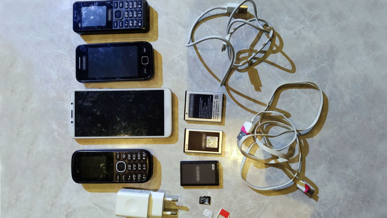 ... смартфоны, также шесть зарядных устройств, гарнитура, провода и несколько сим-карт.
