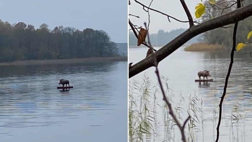 Необычный кадр поймали местные жители — кабан на доске плывёт по реке.