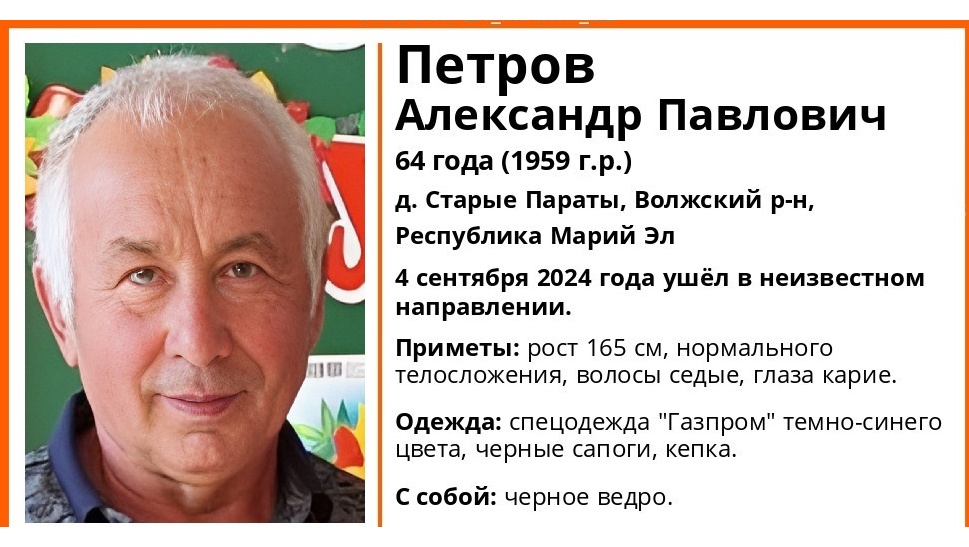 В деревне Старые Параты в Волжском районе со вчерашнего дня не знают о местонахождении 64-летнего Петрова Александра Павловича.
