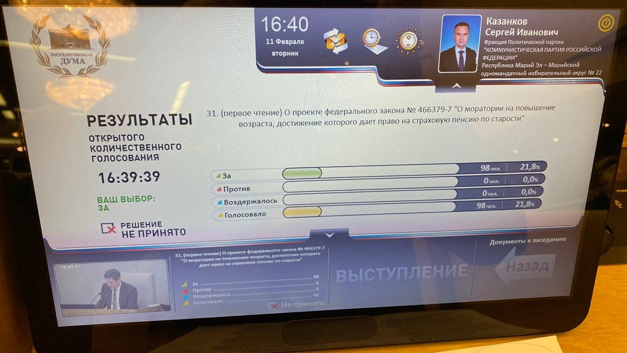 По словам депутата Госдумы от Марий Эл Сергея Казанкова: «Депутаты фракции КПРФ внесли этот законопроект ещё в мае 2018 года, к нашей инициативе присоединились депутаты-справроссы. За прошедшее время его 19 раз включали в повестку дня пленарного заседания, но так и не рассмотрели. Лишь сегодня с 20-й попытки...