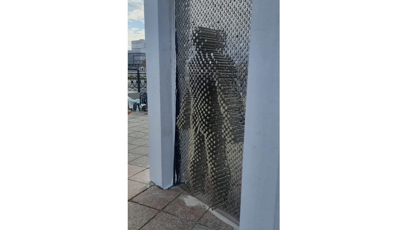 Он представляет собой огромный экспресс-скульптор Fast Sculpt. Его поверхность состоит из множества металлических «гвоздиков», которые с легкостью превращают в объёмную инсталляцию любую приложенную к ним фигуру.