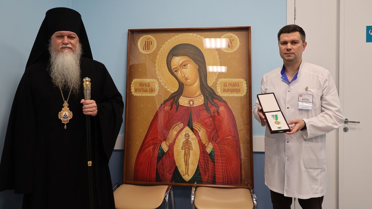Епископ Феофан вручил главврачу Волжской ЦГБ Патриаршую награду.