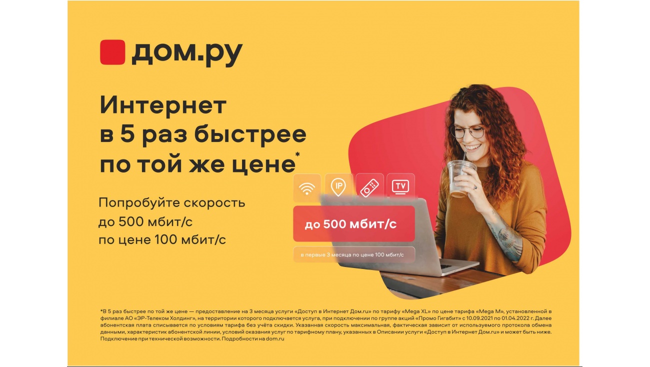 АО «ЭР-Телеком Холдинг» (ТМ «Дом.ру») запустил новую акцию для высокоскороcтных тарифов линейки Mega со скоростью 500 Мбит/сек.