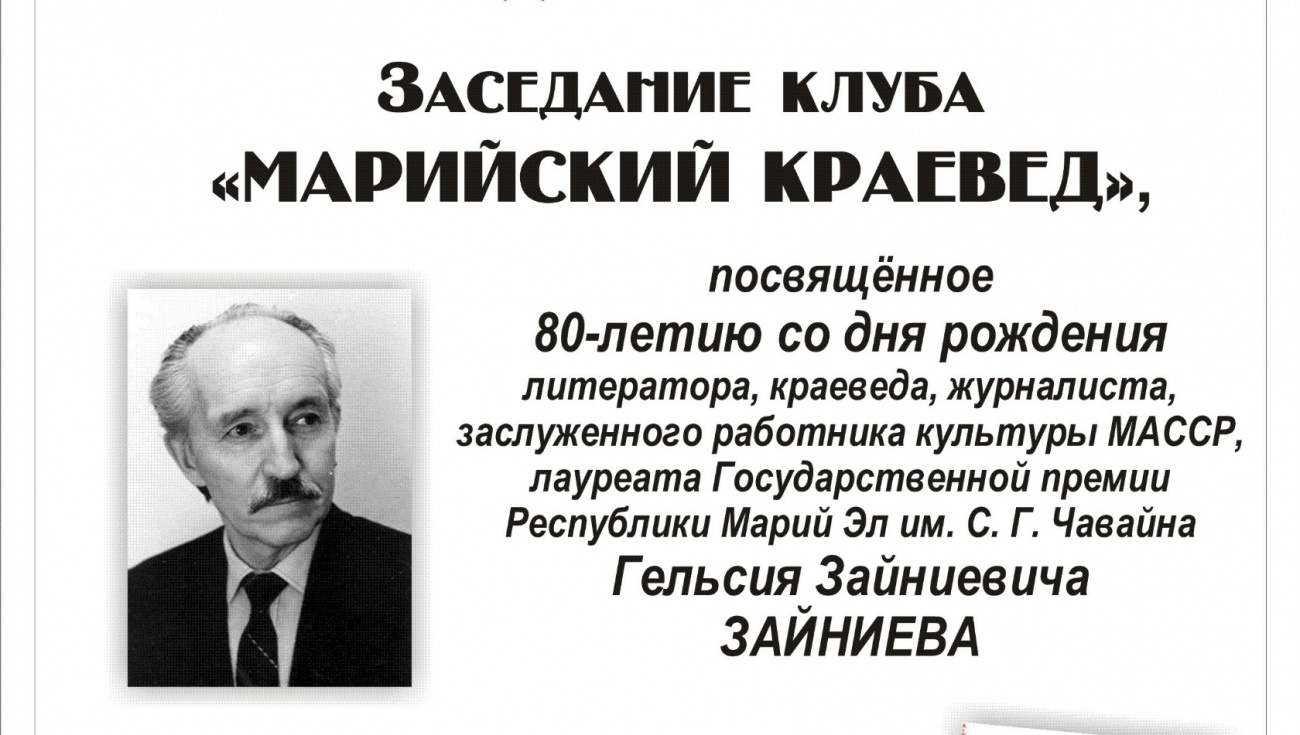 В четверг, 31 октября, в Национальной библиотеке имени С. Г. Чавайна состоится 118-е заседание клуба «Марийский краевед». Оно будет посвящено 80-летию со дня рождения Гельсия Зайниевича Зайниева, литератора, краеведа, журналиста, заслуженного работника культуры Марийской...