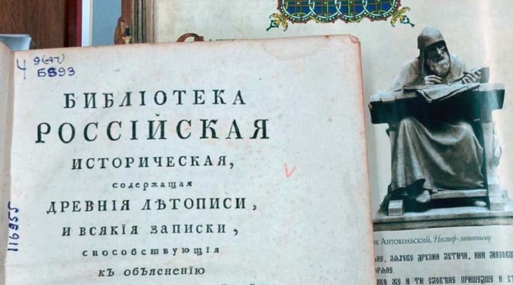 ещё одно издание из коллекции книг XVIII века — «Библиотека российская историческая, содержащая древние летописи и всякие записки, способствующие к объяснению истории и географии российской древних и средних времен. Часть I. Летопись Несторова с продолжателями по Кенигсбергскому списку, до 1206 года».