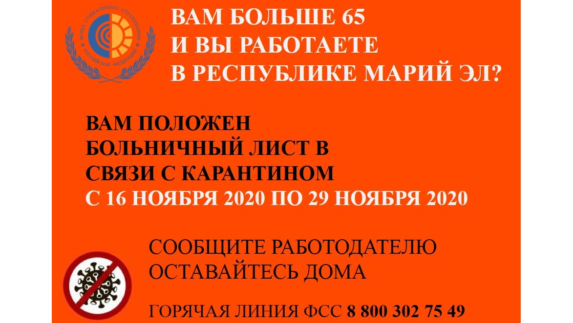 Региональное отделение Фонда социального страхования Российской Федерации по Марий Эл информирует, что жителям республики, достигшим по состоянию на 16 ноября 2020 года возраста 65 полных лет, состоящим в трудовых отношениях, за исключением лиц, переведенных на дистанционный режим работы или находящихся в ежегодном оплачиваемом отпуске, на период с 16 по 29 ноября 2020 года...