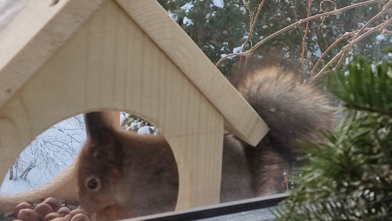 В Ботаническом саду мороз пригнал к кормушкам белочку