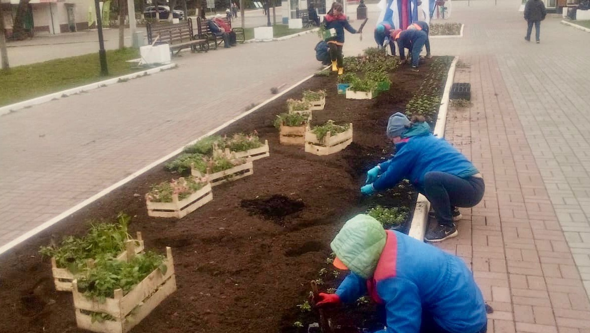 Сегодня озеленители МУП «Город» высаживали цветы на клумбах по бульвару Победы.