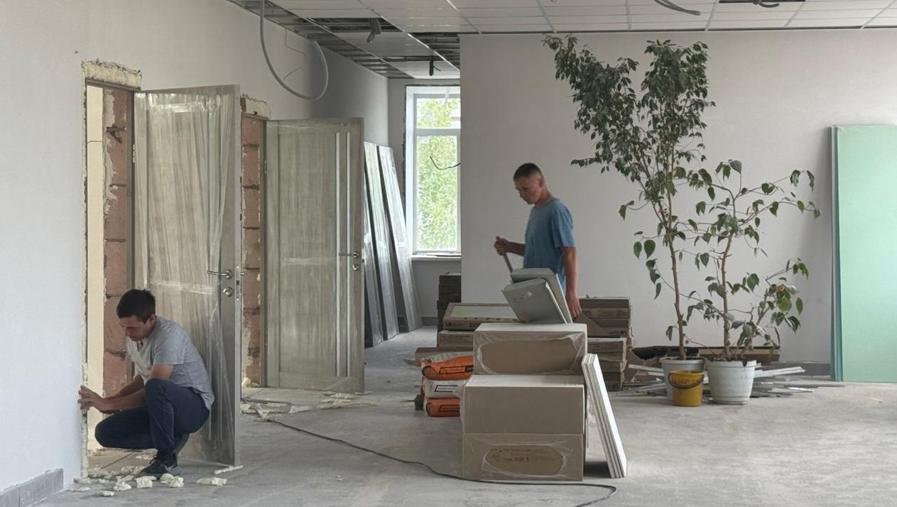 В здании 1972 года постройки уже завершены демонтаж полов, дверей, перегородок в кабинетах и актовом зале, монтаж сцены и заливка полов, штукатурка и шпаклёвка стен, заменены оконные блоки на ПВХ, смонтирована электропроводка и т.д.