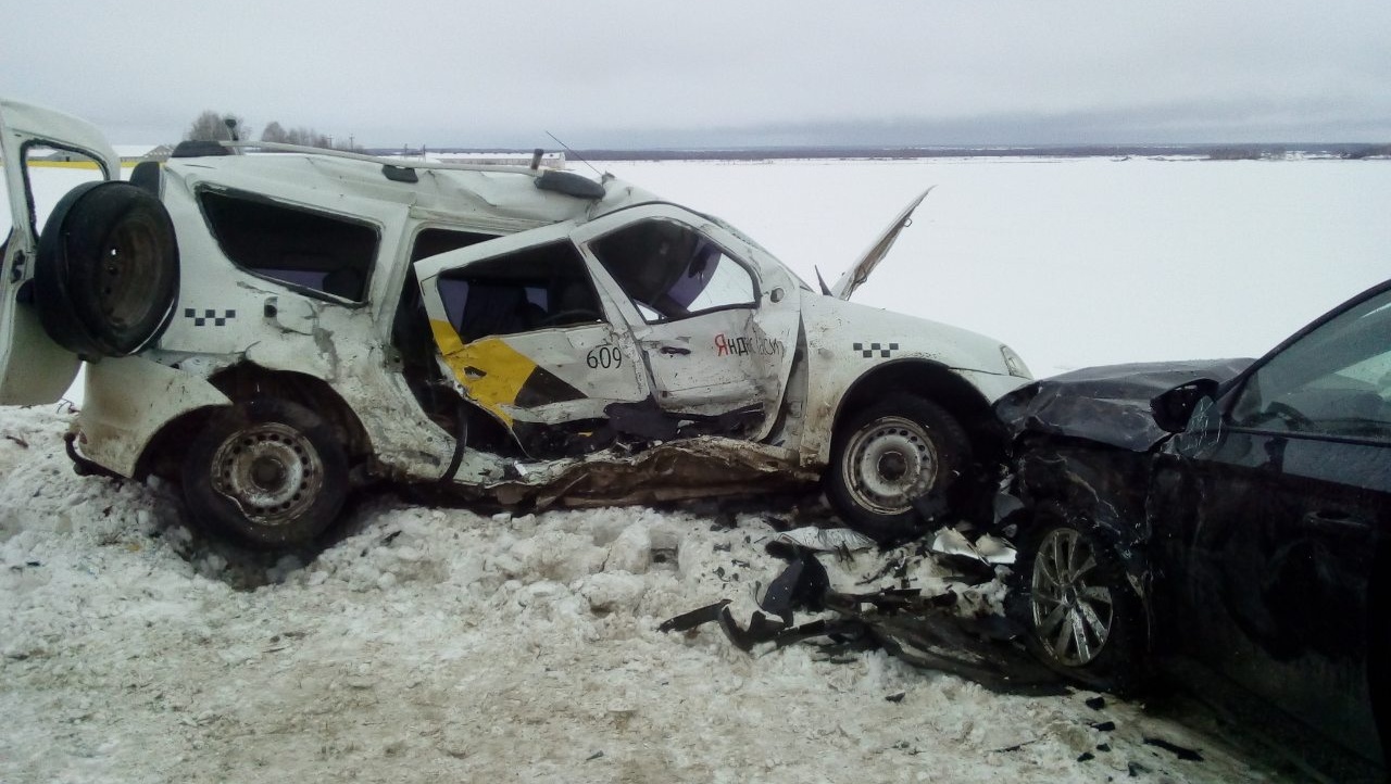 Сегодня утром в пригороде Йошкар-Олы произошло серьёзное ДТП. На 9 км автодороги Йошкар-Ола - Уржум водитель Lada Largus в сложных погодных условиях выехал на встречку и врезался в автомашину Skoda.