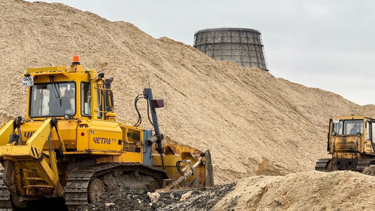 ... пескосоли. На территории асфальтобетонного завода бульдозеры перемешивают компоненты противогололёдного материала.