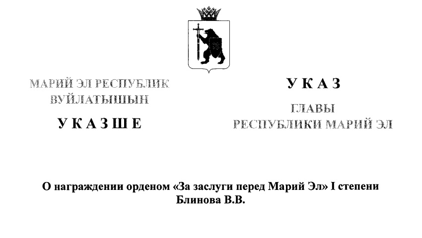 Глава Марий Эл Юрий Зайцев подписал Указ № 59 о награждении главы администрации Новоторъяльского района Василия Васильевича Блинова орденом «За заслуги перед Марий Эл» I степени.