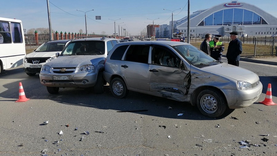 В Йошкар-Оле на перекрёстке Царьградского и Воскресенского проспектов произошло ДТП. По предварительным данным, 60-летний водитель ВАЗ-1117 не уступил дорогу автомобилю Nissan и врезался в иномарку. В свою очередь в «Ладу Калину» влетала «Нива Шевроле», которая двигалась следом.