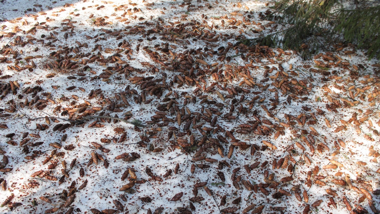 Выдаёт её обилие кучи еловых шишек под деревом.