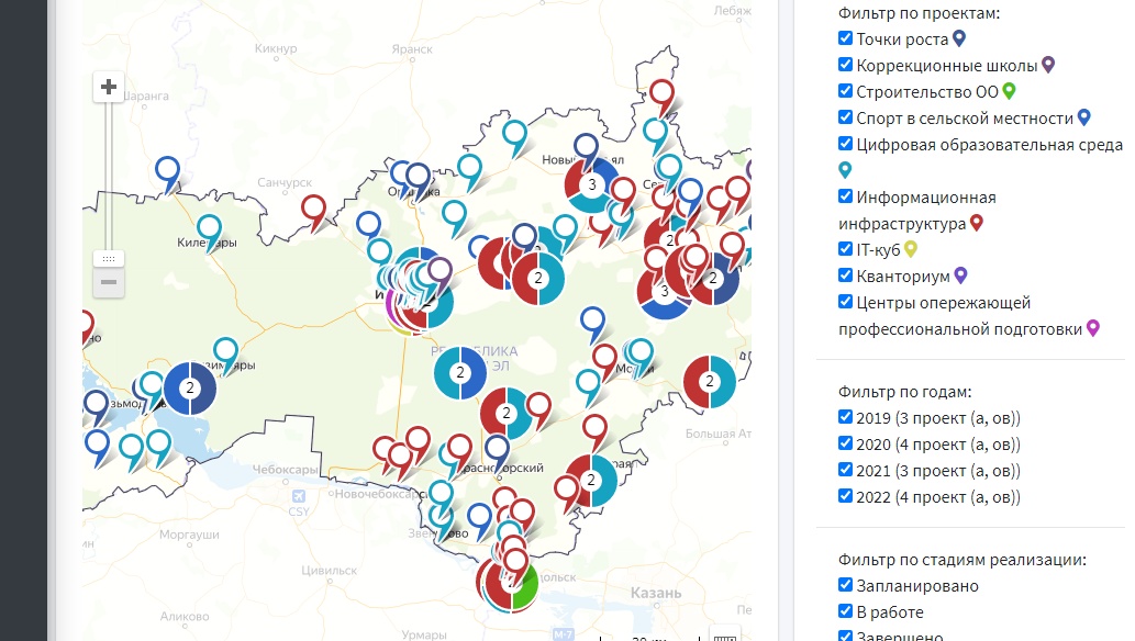 На интерактивном представлении картографической схемы Марий Эл отражены образовательные организации, на базе которых реализуются мероприятия региональных проектов, входящих в состав национального проекта «Образование»: