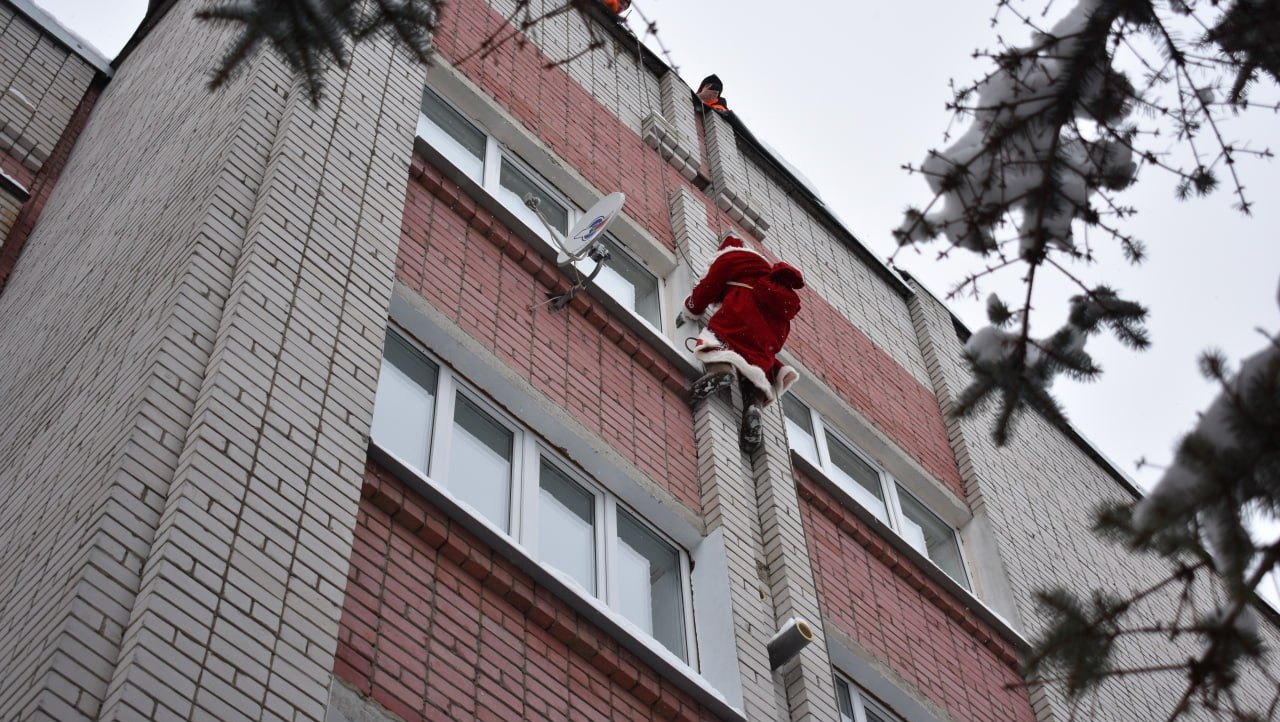 Спасатель Центрального аварийно-спасательного отряда Алексей Калинин в костюме Деда Мороза при помощи альпинистского снаряжения спустился в окно игровой комнаты, где главного волшебника уже с нетерпением ждали дети.