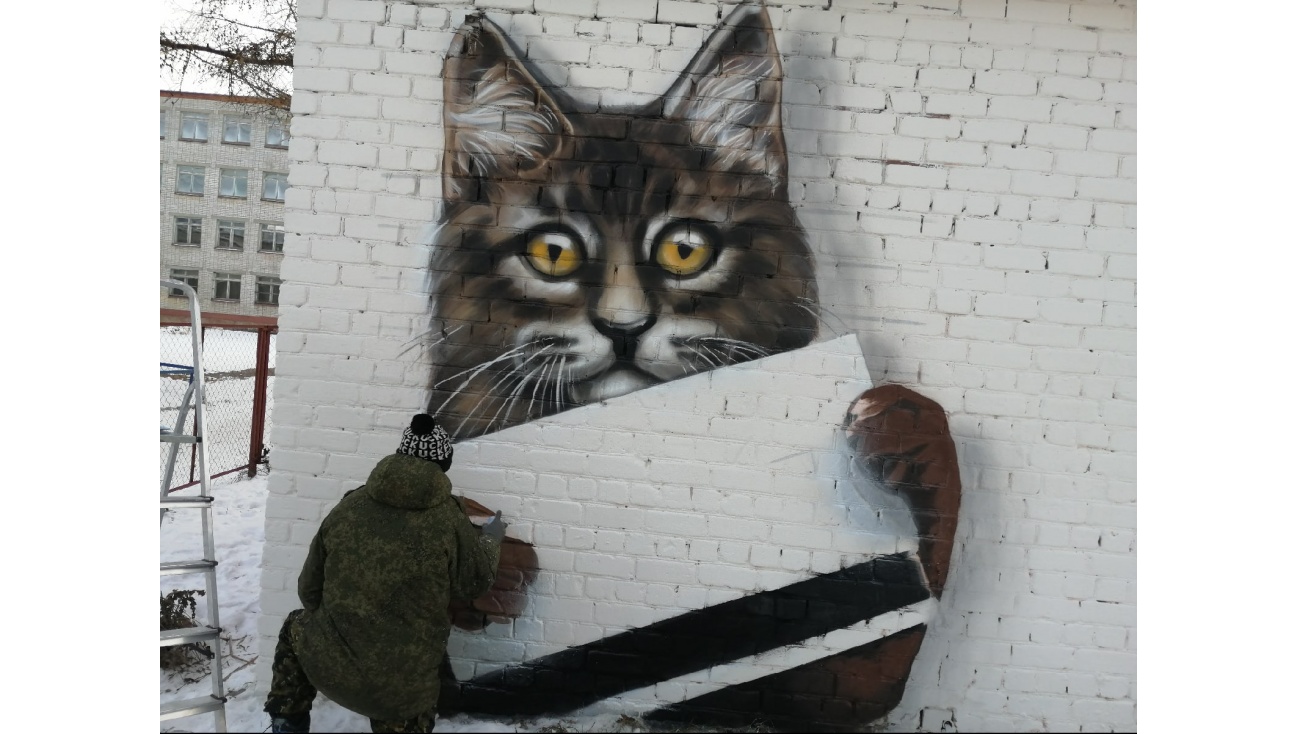 Четвертый день известный уличный художник Илья Белов работает над антинаркотическим граффити. Очаровательный кот ...
