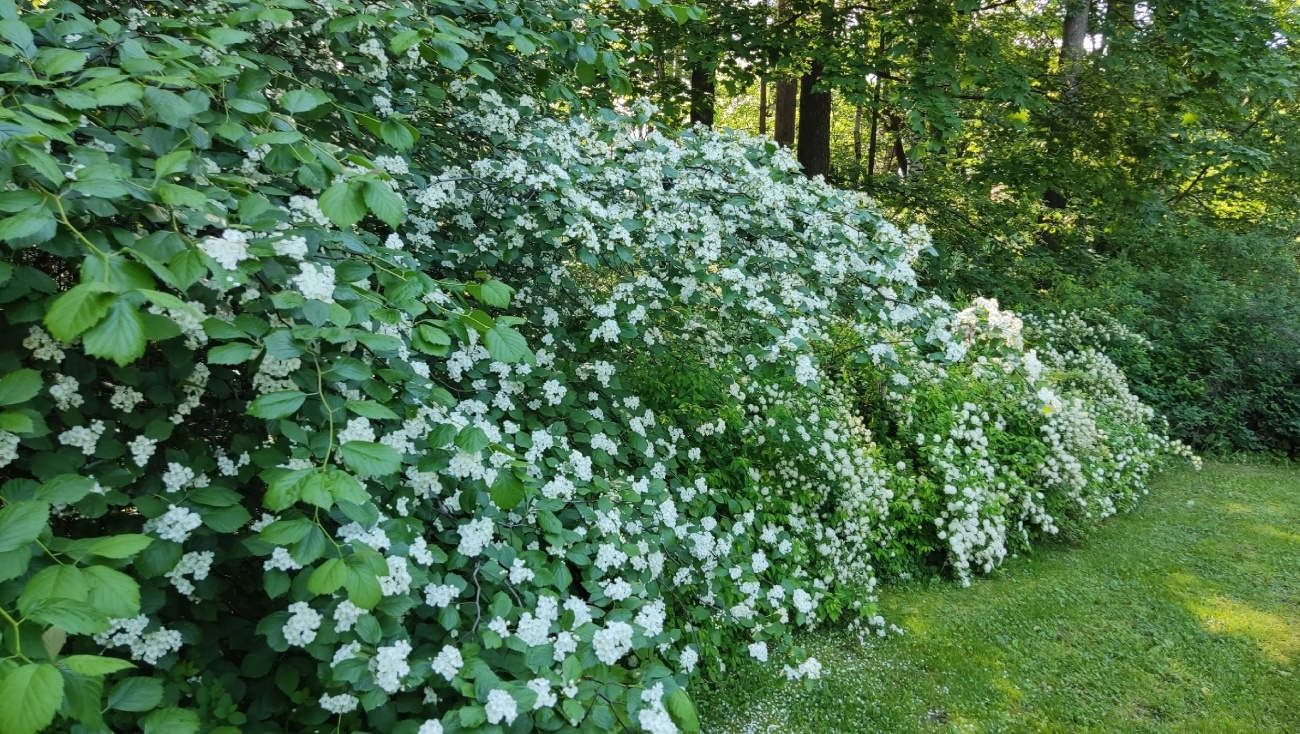 В первом ряду высокие кустарники: бузина, калина, боярышники, клён Гиннала. Второй ряд пониже: свидина, жимолости, чубушники. На переднем ярусе плотные невысокие ...