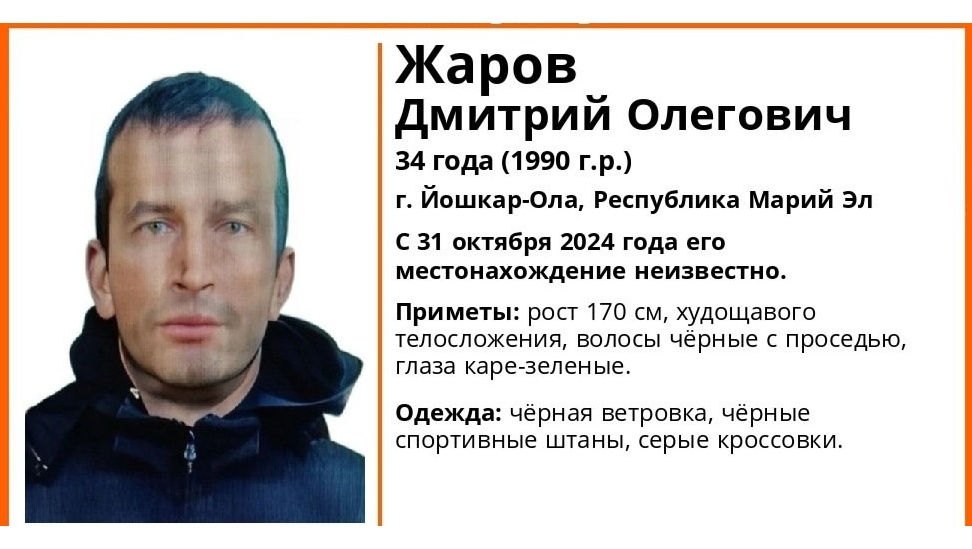 В Йошкар-Оле уже две недели не знают о местонахождении 34-летнего Жарова Дмитрия Олеговича. Мужчина пропал 31 октября.
