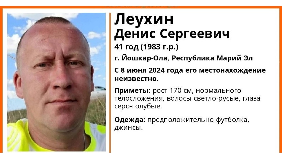 В Йошкар-Оле уже два месяца не знают о местонахождении 41-летнего Леухина Дениса Сергеевича. Мужчина пропал 8 июня.