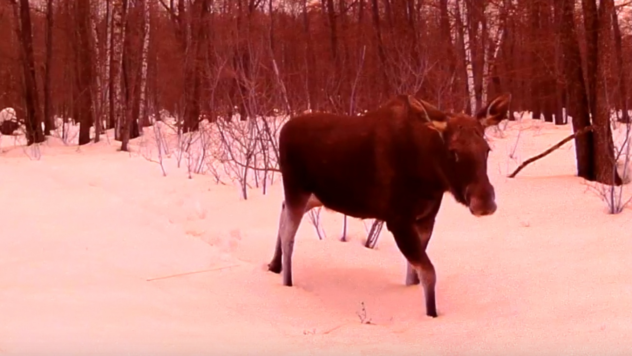 В этот раз камеры сняли лосиху. Животное, судя по всему, искало еду.