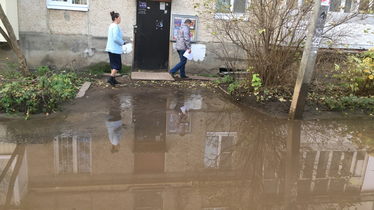 Схожая ситуация и у жителей дома по улице Дружбы. Здесь перед первым подъездом лужа также после осадков разливается на несколько метров по всей ширине дороги и затапливает тротуар.