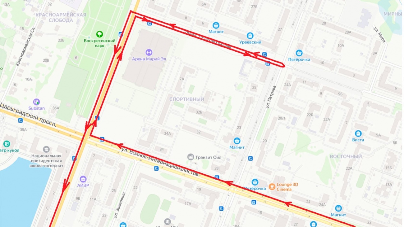 Йошкар-Ола (ул. Западная, ул. Йывана Кырли, ул. Красноармейская, ул. Первомайская, ул. Пушкина, ул. Вознесенская, Ленинский проспект, ул. Кирова, ул. Воинов...