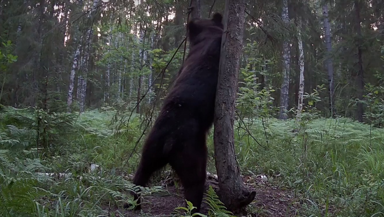В объектив попал медведь, который поднялся на задние лапы и потёрся об дерево.