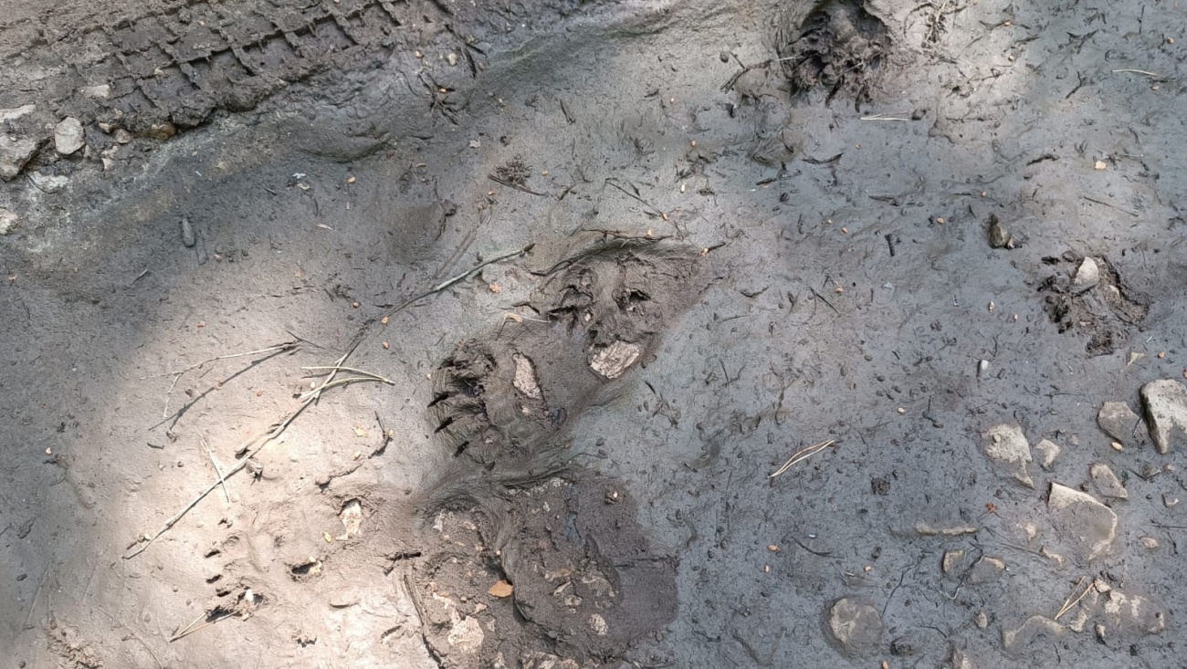 Недавно в лесу сфотографировали свежие следы взрослой медведицы и её маленького медвежонка.