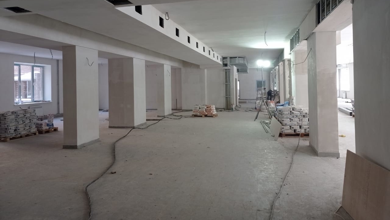 В здании выполняются монтаж металлоконструкций, установка наружных и внутренних инженерных сетей, вентиляции, внутренней штукатурки стен и заделка плиточных швов. Рабочие также занимаются стяжкой полов, прокладкой электрики.