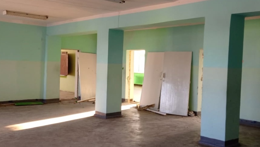 В настоящее время подрядчик демонтирует старое покрытие полов и стен. Разобран спортивный зал. Также уже сделана разводка новой проводки. В некоторых помещениях штукатурят стены.