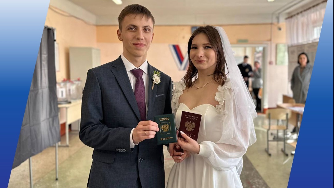 Сразу после церемонии бракосочетания в ЗАГСе Виктор и Анастасия Кошкины отправились на избирательный участок.