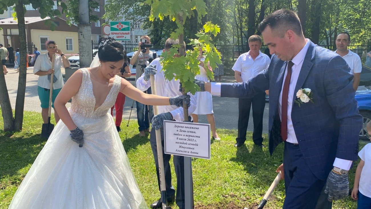 Сегодня в канун Дня семьи, любви и верности молодожёны Михаил и Анна Морозовы посадили клён у Перинатального центра Йошкар-Олы.