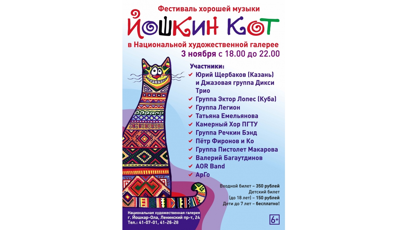 В воскресенье, 3 ноября, Национальная художественная галерея проведёт «Ночь искусств» — ежегодный культурный проект, в рамках которого запланирован Фестиваль хорошей музыки «Йошкин Кот-2019».