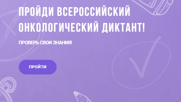 Просветительский проект Минздрава России «Всероссийский онкологический диктант» проводится для повышения информированности населения об онкологических заболеваниях. Он проводится в формате теста, на прохождение которого отводится один час. По его итогам каждый участник получит сертификат и рекомендации от экспертов.