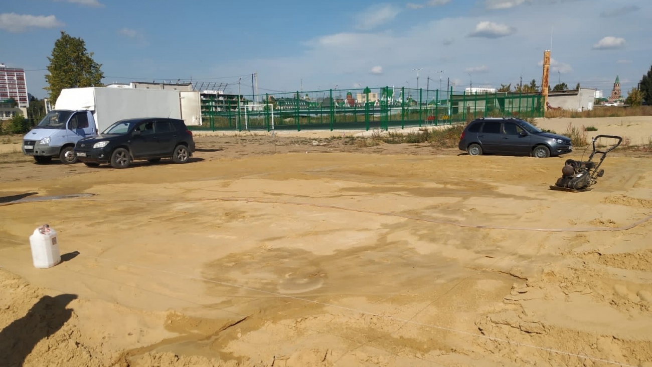 На сегодняшний день здесь уже утрамбовали до выставленных отметок привезённый песок и завершили устройство подстилающих и выравнивающих слоёв основания.