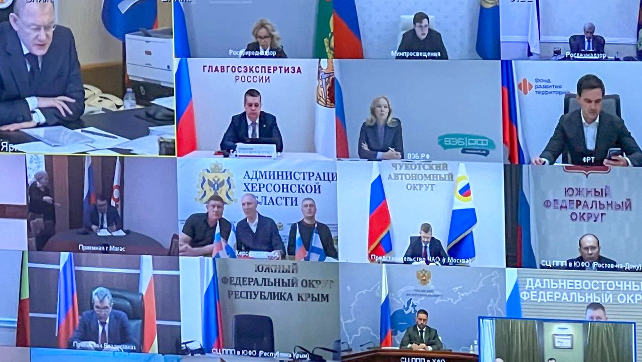 На заседании обсуждались вопросы восстановления населённых пунктов, расположенных на территориях ДНР, ЛНР, Херсонской и Запорожской областей.