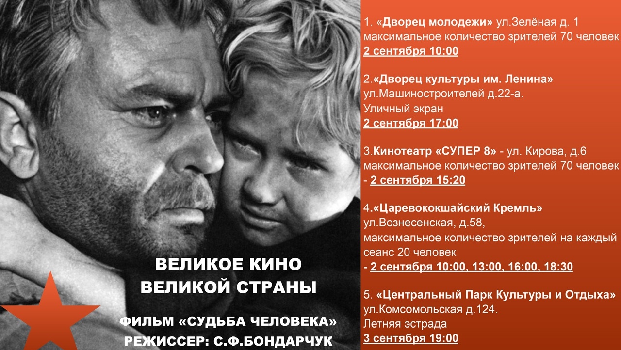 2 и 3 сентября жителям и гостям Йошкар-Олы бесплатно покажут легендарный военный фильм в рамках международного проекта «Великое кино Великой страны».