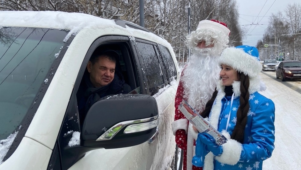Водителей в посёлке Медведево с Новым годом поздравили «Полицейский Дед Мороз», Снегурочка и студенты-волонтёры.