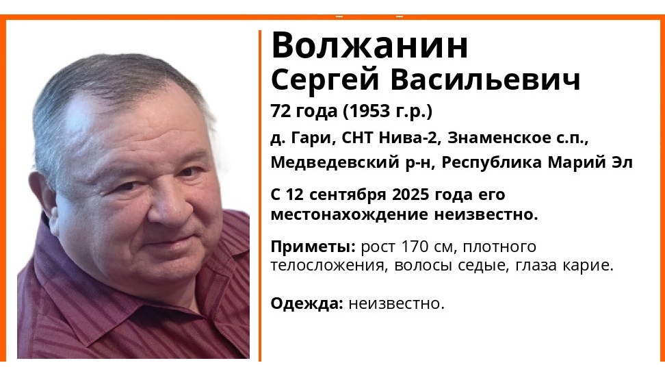 В Медведевском районе 12 сентября пропал 72-летний житель деревни Гари, СНТ «Нива-2» Волжанин Сергей Васильевич.