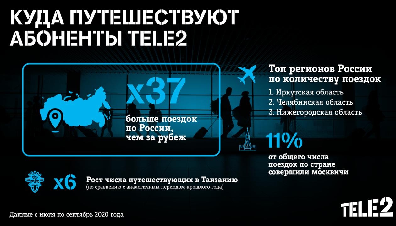 Tele2 проанализировала поездки клиентов по России и за рубеж с помощью технологий big data. Число путешествий внутри страны оказалось в 37 раз больше количества выездов за пределы России. Самыми активными путешественниками были москвичи — на них приходится 10-я часть всех поездок. Наиболее востребованными направлениями стали Иркутская область, Турция и Казахстан.