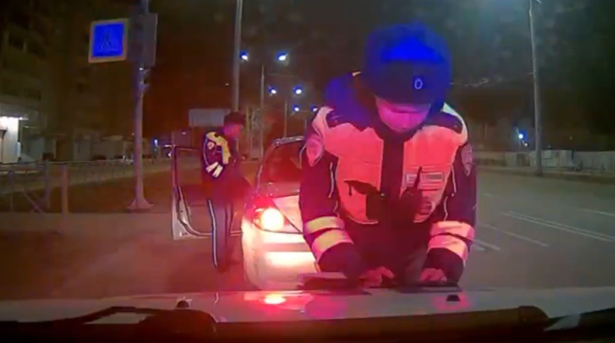 Инспекторы остановили ТС для выяснения всех обстоятельств. Водитель в ходе разговора с сотрудником ДПС предпринял попытку уехать.