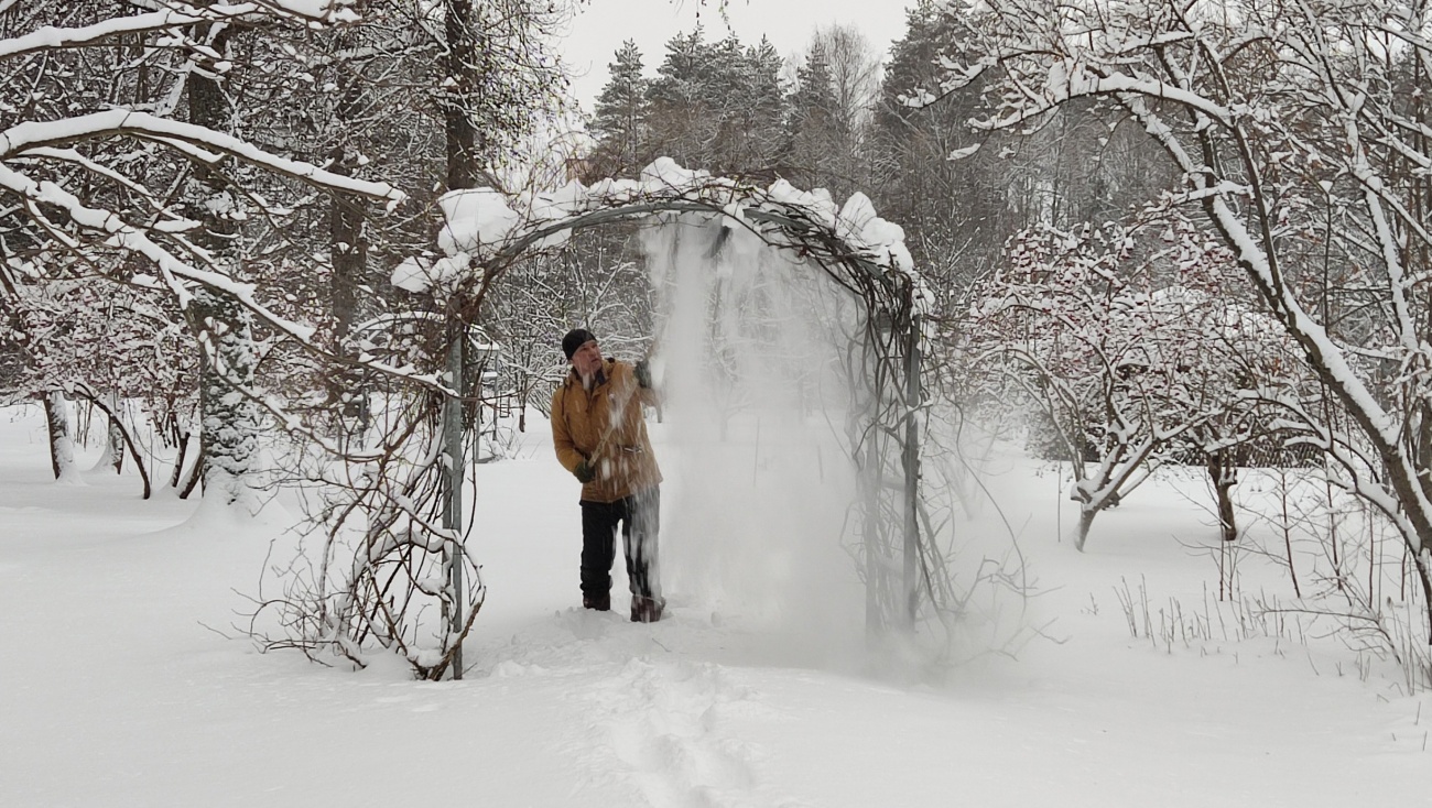 Тяжёлая снежная масса может сломать и погубить растения, поэтому с них регулярно стряхивают снег.