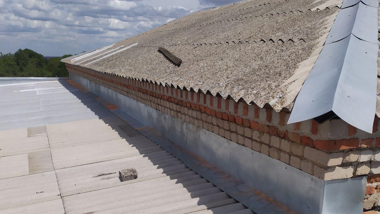 Шифер на здании был местами разрушен, из-за чего внутрь попадала вода. Мастера заменили повреждённые листы.