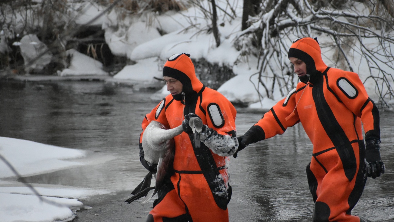 Чтобы вытащить её оттуда, спасатели облачились в специальные гидрокостюмы и последовали к ней по воде. Не без усилий спустя время лебедя удалось поймать. Спасённую птицу привезли на зимовку в...
