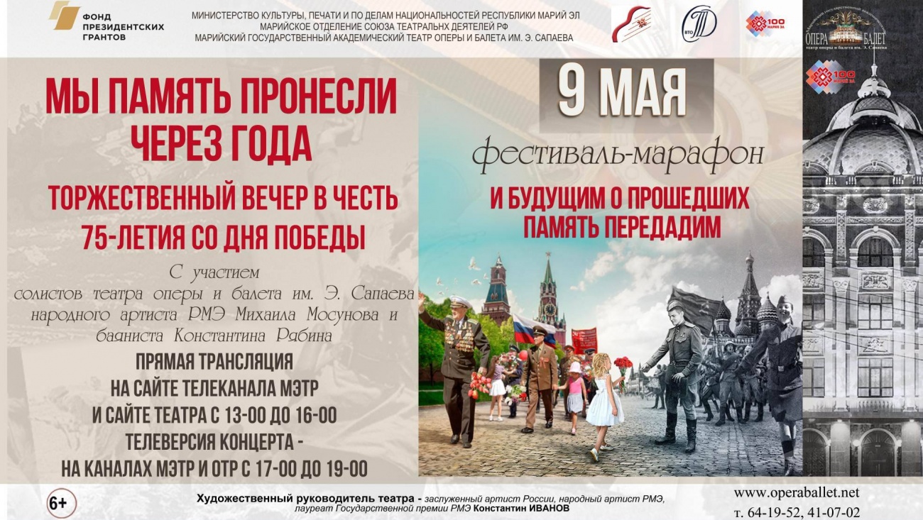 Ко Дню Победы Марийский государственный академический театр оперы и балета имени Эрика Сапаева готовит уникальную программу. Как сообщила пресс-служба Министерства культуры, печати и по делам национальностей Марий Эл, 9 мая в прямом эфире состоится концерт-марафон «Мы память пронесли через года».