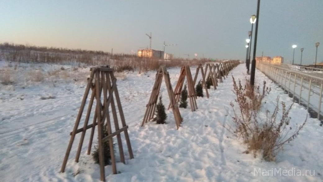 В «Сомбатхее» на Аллее здоровья появились деревянные заграждения. Чтобы сохранить саженцы туй от непогоды и вандалов специалисты МУП «Город» закрыли их деревянными щитами. Как рассказали ИА МариМедиа в администрации предприятия, работы были завершены две недели назад.